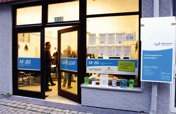 1. The MoBil-Lernladen (learning shop), which is a fixed contact point and a low-threshold place for learning and guidance. During the opening hours everybody can come in without an appointment and is getting information about further education. Computers are also available and can be used by the visitors for individual research.